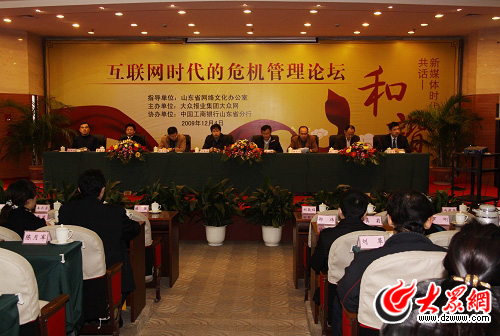 山東省網絡文化辦公室主任劉致福出席本次論壇,中央財經大學危機管理學院創始人和執行院長,中國人民大學危機傳播管理研究中心研究員、中國應急管理高峰論壇常務秘書長董傳儀,人民網副總裁官建文,搜狐網總編室主任魏成和百度網公關事務部高級經理趙承分別就危機管理發表專題演講。大眾網總編輯、總經理潘子江主持論壇。