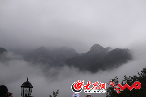 22日下午5點(diǎn)半,雨后泰山突現(xiàn)云山奇觀,泰山之巔遠(yuǎn)遠(yuǎn)望去,黑壓壓的云層像大山一般氣勢(shì),而索道上的纜車更像穿梭于大山之中。