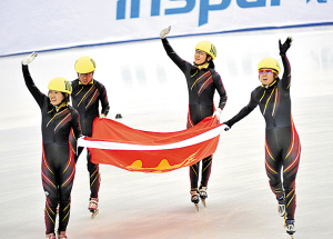 ■黑龍江女隊獲得女子短道速滑接力賽冠軍。 本欄攝影 周光輝