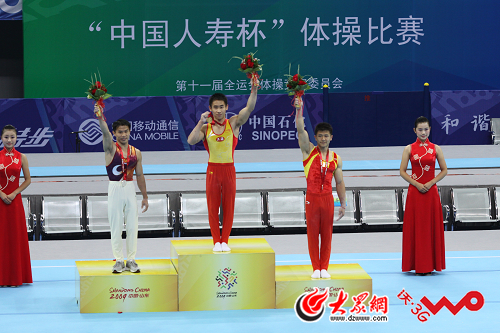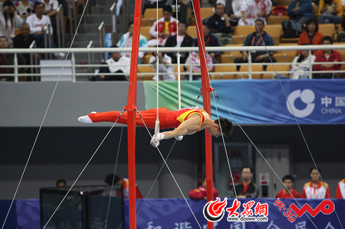 大眾網-山東聯通3G聯合報道(記者 明清 爾印 吳哲 新婷 洪棟)在今晚體操吊環單項比賽中,來自上海的嚴明勇以15.975的成績勇奪冠軍,福建小伙謝劍輝奪得銀牌,北京奧運會吊環王陳一冰未能登頂,僅拿到銅牌。