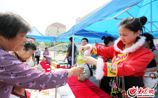 30日早上8點(diǎn)剛過(guò),濟(jì)南南全福廣場(chǎng)上便迎來(lái)專程趕來(lái)品嘗北川茶的濟(jì)南市民,他們有的來(lái)自附近的小區(qū),有的驅(qū)車十幾里路從老遠(yuǎn)的西郊趕來(lái),幾位身著羌族服裝的青年為市民倒著一杯杯濃香的北川茶。