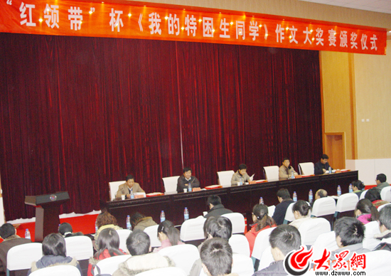 2007年年底,隨著愛心助學崗的啟動,公司舉辦了“紅領帶”杯我的特困生同學作文大獎賽活動,圖為在山東師范大學多媒體室召開的頒獎儀式現場。