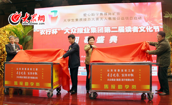 為了給更多的駐濟高校大學(xué)生提供社會實踐和勤工儉學(xué)的機會,大眾報業(yè)集團發(fā)起的“愛心助學(xué)售報崗”大型愛心助學(xué)活動又再度擴容30個愛心助學(xué)售報崗。山東省委高校工委副書記邢善萍和大眾報業(yè)集團黨委常委、副總編輯郝克遠,山東中醫(yī)藥大學(xué)黨委副書記、校長歐陽兵,大眾報業(yè)集團總編輯助理、齊魯晚報·生活日報總編輯藍海等為新擴容的愛心助學(xué)售報崗揭幕。