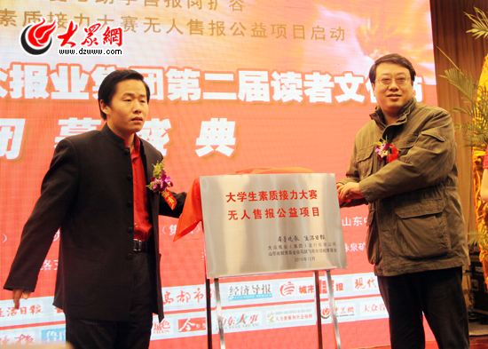 大眾報業(yè)集團總編輯助理、齊魯晚報、生活日報總編輯藍海(右)、山東省教育基金會馬踏飛燕專項教育基金主任馬飛為“大學(xué)生素質(zhì)接力大賽無人售報公益項目”啟動揭牌。