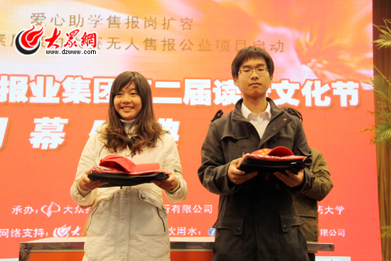 大眾網(wǎng)濟南12月16日訊 (記者 吳哲 盛堃)今天上午,以“感恩、回饋、傳承”為主題的“農(nóng)行杯”大眾報業(yè)集團第二屆讀者文化節(jié)在歷時4個多月后閉幕。在長清山東省中醫(yī)藥大學(xué)舉行的讀者節(jié)閉幕盛典上,大眾報業(yè)集團發(fā)起的“愛心助學(xué)售報崗”活動不僅迎來了30個崗位的擴容,大學(xué)生素質(zhì)接力大賽無人售報公益項目也于今日正式在駐濟各高校啟動。