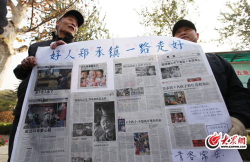 在送別儀式上,來自濟南天橋區的73歲老人安守財,手里拿著一張自制的鄭承鎮事跡簡報站在了隊伍的最前面。安守財告訴記者,自從2006年濟南評選第一屆道德模范時就與鄭承鎮相識,并對其感人的事跡十分佩服。從媒體報道中,安守財得知今天下午舉行鄭承鎮遺體告別儀式,他便騎著自行車,趕了半個多小時的路程來送送他心中的好大哥鄭承鎮。