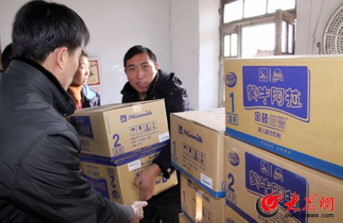 蒙牛阿拉乳制品有限公司濟南銷售處經(jīng)理李營生代表公司向孩子捐助奶粉