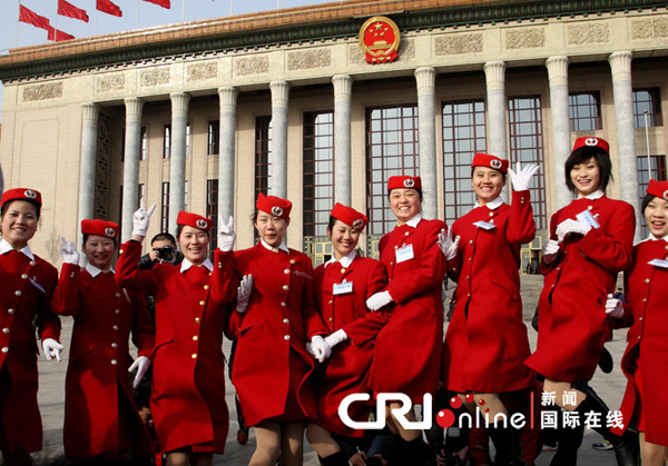2010年3月13日,全國政協十一屆三次會議在人民大會堂舉行閉幕會。年輕靚麗的禮儀人員的笑容為閉幕式增添了春的氣息。禮儀人員在大會堂前合影。