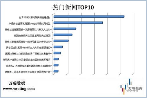 從國內著名第三方數據公司——萬瑞數據全流量監測系統(SiteRatingTM)提供的相關數據來看,不到24小時內,關于“英德大戰”的新聞總點擊率已經超過百萬,可見這場勢均力敵的遭遇戰,不僅激起了雙方的斗志更加點燃了網友觀球的熱情。其網絡關注度一路攀升,遠遠超越了這2個小組的另一對選手。從網友點擊率最高的新聞前TOP10來看,輿論已經為這場即將到來的大賽鋪墊好了略帶肅殺的氛圍,讓人不僅感到既緊張又興奮(如圖)。