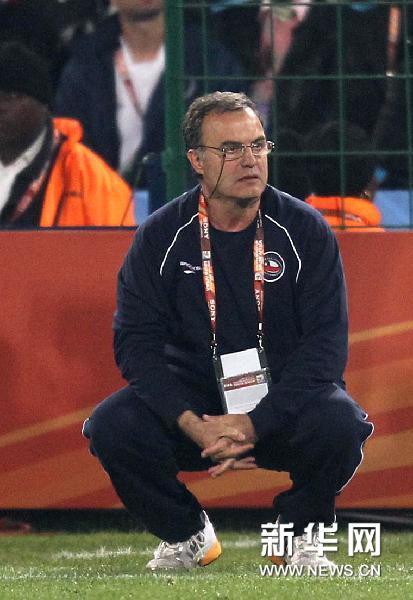 6月25日,智利隊主教練貝爾薩蹲在場邊觀看比賽。當日,在2010年南非世界杯小組賽H組最后一輪比賽中,智利隊1比2不敵西班牙隊。新華社記者邢廣利攝