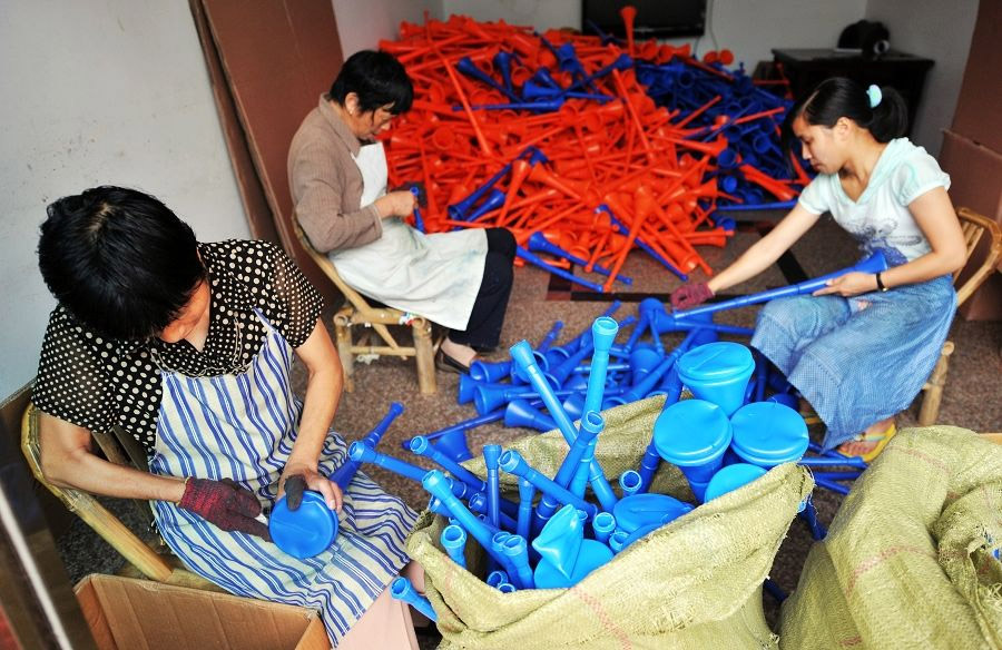 6月22日,浙江寧海縣一家塑料玩具廠的工人在加緊制造“嗚嗚祖拉”,這些工人每月的工資在2000元左右。