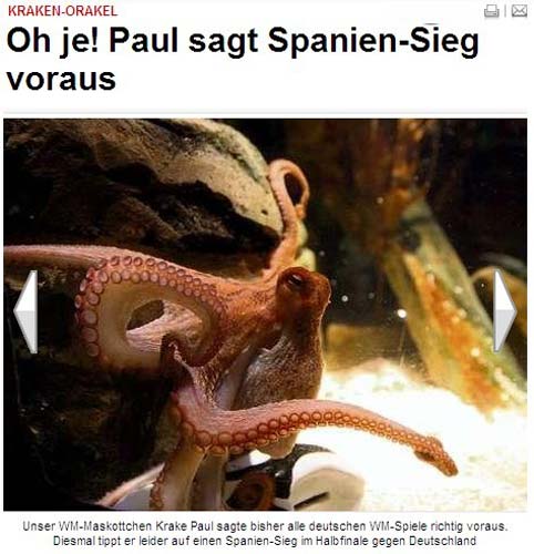 遺憾的是,章魚保羅的預測與本屆世界杯第二次預測一樣,沒有選擇德國,而是選擇了德國的對手。德國媒體《圖片報》文字直播宣布章魚保羅的選擇后,直播員說道,“希望勒夫的小伙子們能扭轉局勢,拯救這場半決賽。”很顯然,這個結果讓眾多德國球迷很失望,他們期待著章魚保羅這次預測失敗;而反觀西班牙球迷,在看到這個結果后,已經迫不及待的想看斗牛士參加決賽的場景。
