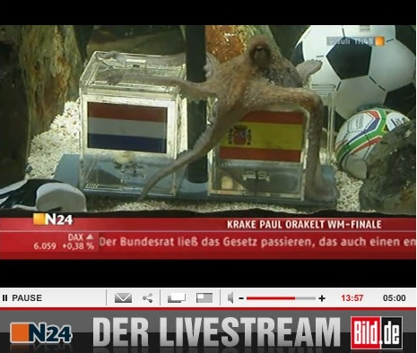 章魚保羅的預測在北京時間下午17時正式開始,這一次保羅的預測比前面幾次都要迅速,一周前它在預測德國與阿根廷的比賽時用了一個多小時,這一次保羅只用了11分鐘。章魚來到透明的水族箱里后,很快就盤上了標有德國國旗的盒子,隨后打開蓋子將里面的貝殼取出吃掉,這也預示著德國隊將取得本場比賽勝利,章魚保羅前面六次預測全部正確。