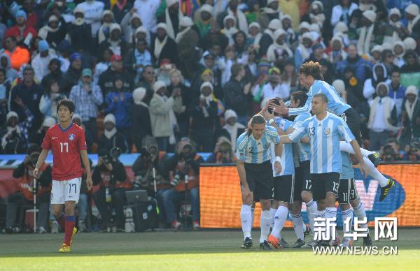 新華網快訊:南非世界杯小組賽B組阿根廷隊對陣韓國隊全場比賽結束,阿根廷隊4:1獲勝。