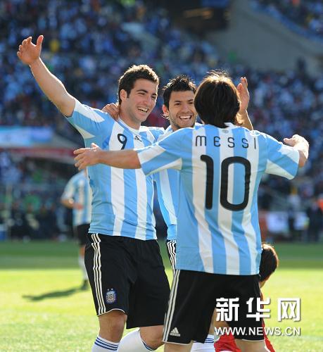 6月17日,阿根廷隊球員貢薩羅·伊瓜因(左)在比賽中和梅西(前)等慶祝進球。當日,在約翰內斯堡舉行的2010年南非世界杯小組賽B組比賽中,阿根廷隊迎戰韓國隊。新華社記者郭勇攝