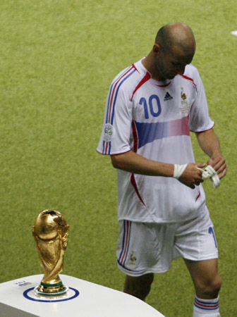 2006年世界杯,齊達內參加在最后和意大利隊的決賽,并打進一個點球,但是在加時賽下半場因為用頭撞擊意大利隊后衛馬特拉齊,被紅牌罰下,結束了世界杯之旅。隨著齊達內與大力神杯擦肩而過的背影,一代大師的演出終于謝幕,這成為了幾乎完美的足球生涯中的一大遺憾。