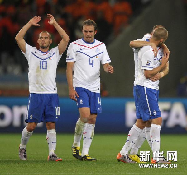6月24日,荷蘭隊球員賽后慶祝勝利。當(dāng)日,在2010年南非世界杯小組賽E組最后一輪比賽中,荷蘭隊以2比1戰(zhàn)勝喀麥隆隊,以三戰(zhàn)皆勝的成績進軍16強。新華社記者邢廣利攝