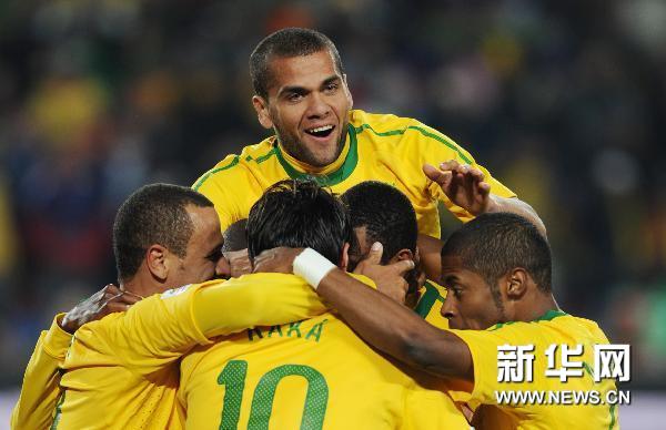 6月28日,巴西隊球員慶祝進球。當日,在約翰內斯堡舉行的2010年南非世界杯八分之一決賽中,巴西隊以3比0戰勝智利隊,晉級八強。新華社記者王毓國攝