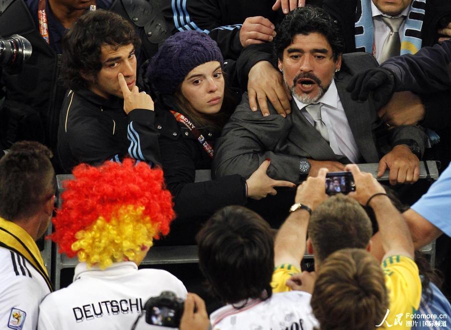 2010年7月3日,南非開(kāi)普敦,2010世界杯1/4決賽,德國(guó)4-0大勝阿根廷,賽后馬拉多納的女兒來(lái)到場(chǎng)邊安慰馬拉多納。圖為:球迷不滿(mǎn)比賽結(jié)果,在看臺(tái)下與老馬發(fā)生爭(zhēng)吵,場(chǎng)面一度失控。