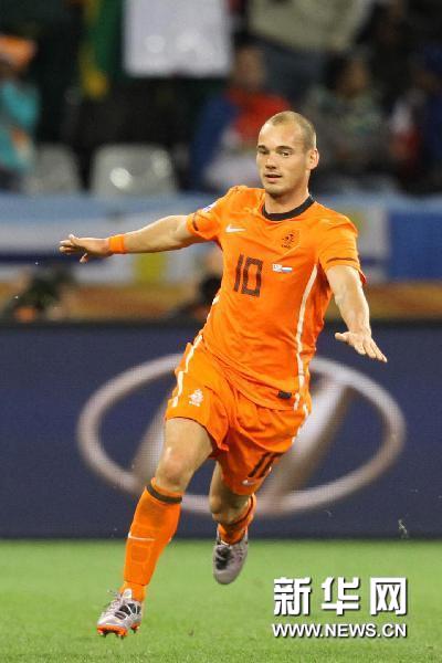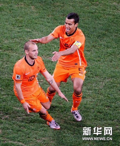 7月6日,荷蘭隊(duì)球員斯內(nèi)德慶祝進(jìn)球。當(dāng)日,2010年南非世界杯半決賽第一場(chǎng)比賽在開普敦綠點(diǎn)球場(chǎng)舉行,荷蘭隊(duì)3比2戰(zhàn)勝烏拉圭隊(duì)。新華社記者邢廣利攝