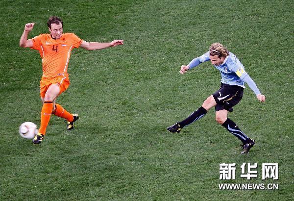 7月6日,烏拉圭隊(duì)球員迭·弗蘭(右)遠(yuǎn)射破門。當(dāng)日,在開普敦綠點(diǎn)球場(chǎng)舉行的2010南非世界杯足球賽半決賽中,荷蘭隊(duì)3比2戰(zhàn)勝烏拉圭隊(duì)。新華社記者廖宇杰攝