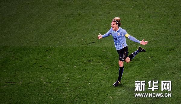 7月6日,烏拉圭隊(duì)球員迭·弗蘭慶祝進(jìn)球。當(dāng)日,在開普敦綠點(diǎn)球場(chǎng)舉行的2010南非世界杯足球賽半決賽中,荷蘭隊(duì)3比2戰(zhàn)勝烏拉圭隊(duì)。新華社記者廖宇杰攝