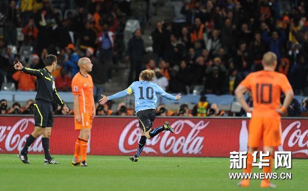 7月6日,烏拉圭隊(duì)球員迭·弗蘭慶祝進(jìn)球。當(dāng)日,在開普敦舉行的2010南非世界杯半決賽中,荷蘭隊(duì)3比2戰(zhàn)勝烏拉圭隊(duì)。 新華社/法新