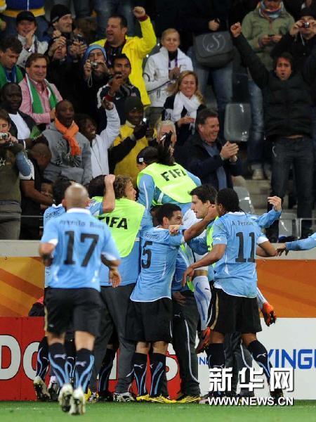 7月6日,烏拉圭隊(duì)球員迭·弗蘭進(jìn)球后與隊(duì)友慶祝。當(dāng)日,在開普敦綠點(diǎn)球場(chǎng)舉行的2010南非世界杯足球賽半決賽中,荷蘭隊(duì)3比2戰(zhàn)勝烏拉圭隊(duì)。新華社記者陳海通攝