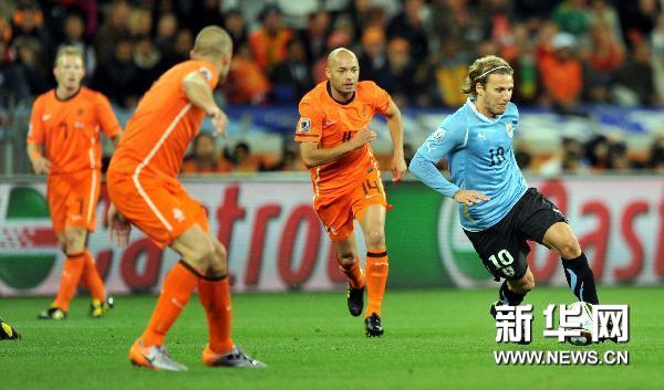 7月6日,烏拉圭隊(duì)球員迭·弗蘭(中)帶球突破。當(dāng)日,2010年南非世界杯半決賽第一場(chǎng)比賽在開普敦綠點(diǎn)球場(chǎng)舉行,荷蘭隊(duì)3比2戰(zhàn)勝烏拉圭隊(duì)。新華社記者楊磊攝