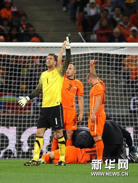 7月6日,荷蘭隊(duì)門將斯特克倫伯格(左)示意隊(duì)友受傷。當(dāng)日,在開普敦綠點(diǎn)球場(chǎng)舉行的2010南非世界杯足球賽半決賽中,荷蘭隊(duì)3比2戰(zhàn)勝烏拉圭隊(duì)。新華社記者邢廣利攝