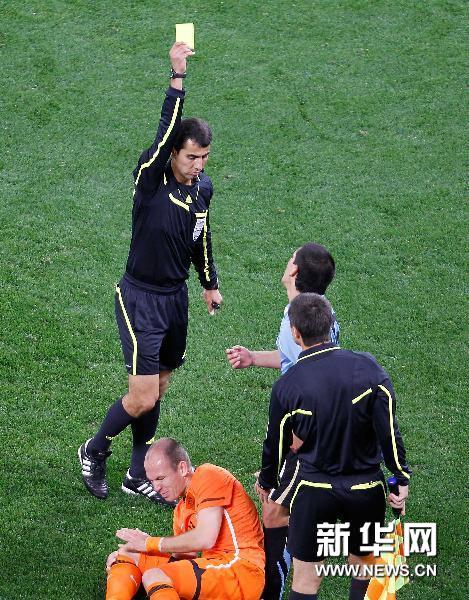 7月6日,主裁判、烏茲別克斯坦人伊爾馬托夫(左一)向?yàn)趵珀?duì)球員馬·佩雷拉(右二)出示黃牌。當(dāng)日,在開普敦綠點(diǎn)球場(chǎng)舉行的2010南非世界杯足球賽半決賽中,荷蘭隊(duì)3比2戰(zhàn)勝烏拉圭隊(duì)。新華社記者廖宇杰攝