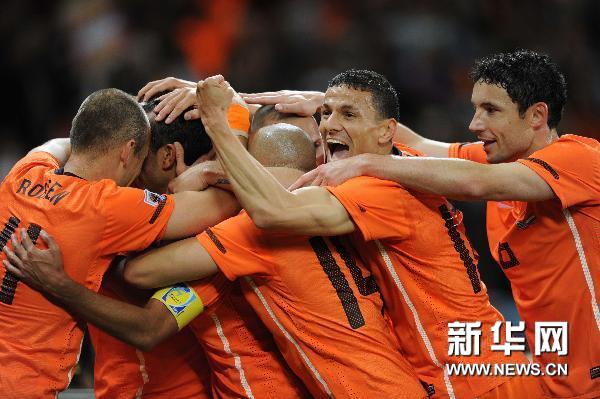 7月6日,荷蘭隊(duì)球員范布隆霍斯特進(jìn)球后慶祝。當(dāng)日,在開普敦綠點(diǎn)球場(chǎng)舉行的2010南非世界杯足球賽半決賽中,荷蘭隊(duì)3比2戰(zhàn)勝烏拉圭隊(duì)。新華社記者陳海通攝