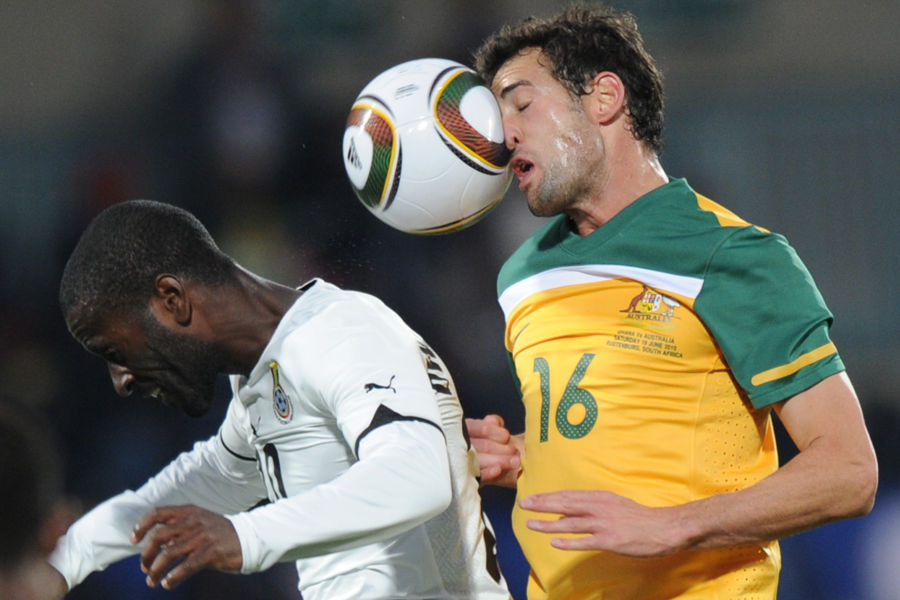 當?shù)貢r間2010年6月19日,約翰內斯堡,澳大利亞終場球員瓦雷里與加納隊阿皮亞爭搶皮球。當天在皇家巴弗肯體育場,澳大利亞與加納隊戰(zhàn)成1-1平。