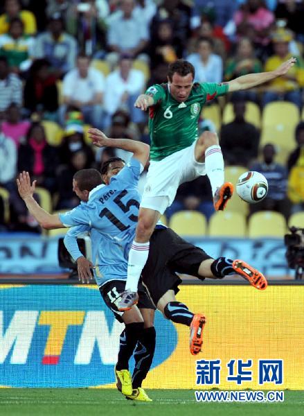6月22日,墨西哥隊球員杰·托拉多(右)與烏拉圭隊球員迭·佩雷斯在比賽中爭搶。當日,在勒斯滕堡舉行的2010南非世界杯A組比賽中,墨西哥隊對陣烏拉圭隊。新華社記者郭勇攝