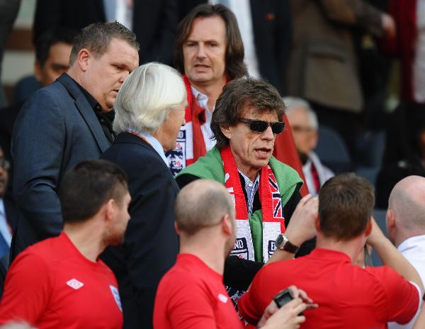 6月27日,英國滾石樂隊主唱賈格爾在看臺上觀戰。當日,在布隆方丹進行的2010南非世界杯八分之一決賽中,英格蘭隊與德國隊對決。新華社/法新