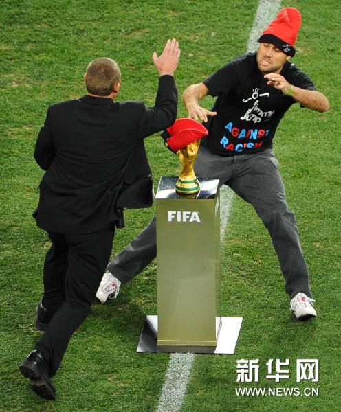 7月11日,一名球迷賽前沖入放置“大力神杯”的場地內,被保安人員驅逐。當日,2010年南非世界杯決賽即將在約翰內斯堡足球城體育場打響,由西班牙隊對陣荷蘭隊。新華社/法新