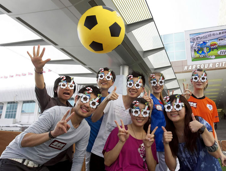 5月26日,市民戴著2010足球造型眼鏡合影。當日,香港市民在香港海港城商場外設置的人造草地足球場上,用自己的方式表達對世界杯的期待,為即將到來的南非世界杯添加氣氛。新華社發(劉永東攝)