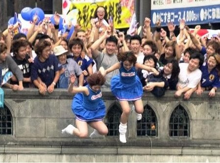 勇敢的日本女球迷 6月25日,在日本隊(duì)3比1取勝丹麥,昂首躋身16強(qiáng)后,日本民眾陷入狂歡。而延續(xù)了2002年日韓世界杯開(kāi)始的傳統(tǒng),大阪道頓堀再次出現(xiàn)聚眾“跳河”慶祝的場(chǎng)面。在超過(guò)1000人的圍觀下,總計(jì)有超過(guò)100名勇敢者跳入水中,借此抒發(fā)心中的狂喜。圖為兩位女球迷跳入河中。