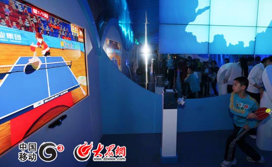 同樣的快樂也在山東館未來廳上演,這里的一臺可以與大屏幕對戰(zhàn)的乒乓球比賽吸引了眾多大孩子和小孩子,漂亮的女工作人員在耐心地給大家演示如何運(yùn)用富含高科技的乒乓球拍,不過由于幾乎所有人都是第一次接觸這么特殊的乒乓球賽,和大屏幕對戰(zhàn)的游客一個個大敗而歸,不過展廳內(nèi)的笑聲卻始終未斷!皺C(jī)器人和乒乓球比賽都很好玩,可惜我玩的都不算好,嘿嘿!”前述四川小女孩笑著對記者說。