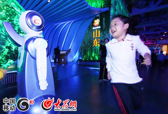 上午10點(diǎn),在山東館序廳前,一臺名為“小魯班”的機(jī)器人格外喜人,不時有小朋友上前與機(jī)器人嬉鬧、合影,一位來自四川的8歲小女孩還開心地圍著“小魯班”玩起捉迷藏,引得很多游客駐足觀看。小女孩玩兒到高興處,又蹦又跳,機(jī)器人“小魯班”也是一會兒跟她打招呼,一會兒表演“蹩腳”的舞蹈。