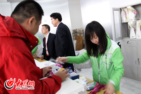 在媒體接待處,一位外國記者向志愿者問詢領取證件的事宜。