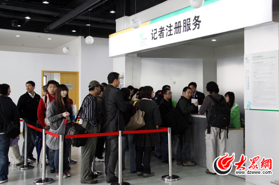 大眾網上海4月26日訊 (特派記者 吳哲 劉國棟)今天,離上海世博會正式開幕還有五天,也是媒體證件領取的第一天,雖然上海的天空又再次飄起了小雨,但位于浦東新區浦東南路的上海世博會注冊中心門前一早還是排起了長長的隊伍。離領證的時間還有半小時,來自境內外的近300名注冊記者就趕到了現場,一位來自燕趙都市報的記者表示:“世博注冊的媒體很多,早領到證件心里踏實些。”