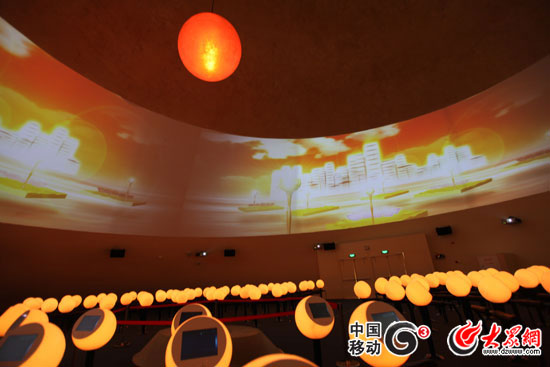 整個以色列館的高潮部分是“創新廳”。艾然說:“一場由漂浮在動態空間里的燈球所呈現的360度視聽演出將在這里演繹。你們慢慢欣賞吧。”約10分鐘的360度多媒體展示,每一個光球都代表著以色列在科學、音樂、文學等各個領域內的創新和技術突破。這也突出了“創新讓生活更美好”的以色列館主題,以及中以兩國在未來的緊密聯系。