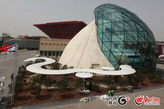 大眾網—移動G3上海4月27日聯合報道(記者 隋喬 劉國棟)從外形看,世博以色列國家館像極了一只來自以色列的巨大“海貝殼”。留學中國的以色列小伙子“艾然”操著一口流利的漢語,為記者介紹了以色列館的情況:“以色列國家館由兩座互相環抱的流線型建筑體組成,像一幅太極陰陽圖,又像兩只緊握的雙手,代表了以色列的歷史與嶄新的現在。”
