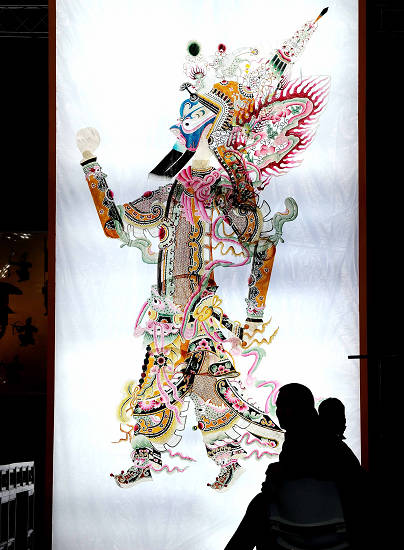 5月1日,兩名游客在皮影戲展區觀看皮影人物造型。當日,上海世博園正式開園迎客。在“中國元素”活動區,用經典劇目片段、傳統文化表演詮釋中國元素,并通過傳承人現場展示讓觀眾在互動中感受中國元素的現代生命力及感染力。活動區設在 “寶鋼大舞臺”,這里源自上海老工業區的風貌,就是這樣一個剛性十足的區域,恰恰演繹著最為柔性的文化形態。新華社記者陳凱攝