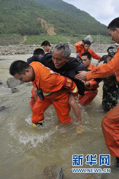 望謨縣消防中隊黨員張瑾背著一名老人過河(6月9日攝)。 新華社發(楊光振攝)