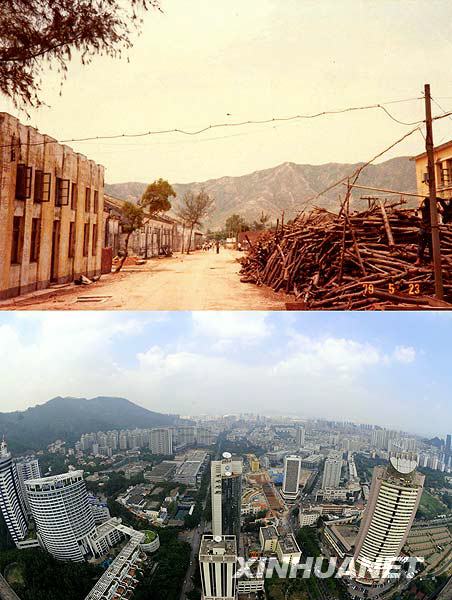 上圖:開發前的深圳蛇口老街(1979年5月23日攝)。下圖:高樓林立的深圳蛇口工業區(2008年10月10日攝)。1979年,中共中央作出了創辦經濟特區的決策。以創辦經濟特區為標志,中國的對外開放邁出了重要步伐。 新華社發(資料圖片)