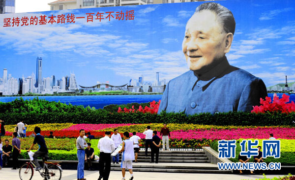 資料圖:2008年10月14日,市民在深圳市深南大道旁的鄧小平畫像前廣場上休閑。新華社發(fā)