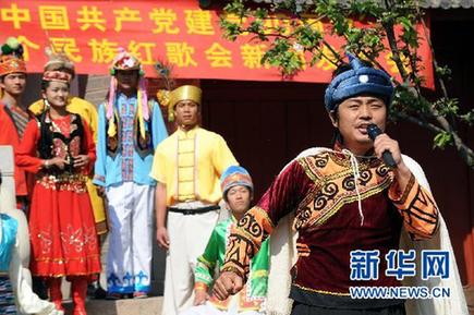 4月22日,中華民族園少數民族原生態藝術團演員在首期紅歌會上唱紅歌。新華社記者張旭攝  4月22日,中華民族園少數民族原生態藝術團演員在首期紅歌會上唱紅歌。為迎接中國共產黨建黨九十周年,北京市愛國主義教育基地、民族團結教育基地——中華民族園,于2011年4月至7月開展“‘唱支山歌給黨聽’56個民族唱紅歌”主題...