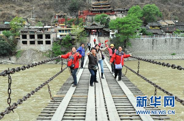 4月17日,一些游客在瀘定橋上留影。今年是建黨90周年,橫跨四川省瀘定縣城大渡河兩岸的瀘定橋迎來了紅色故地旅游熱,每天慕名到此緬懷紅軍長征路上飛奪瀘定橋革命歷史的旅游者超過千人。建成于清代康熙45年(1706年)的瀘定鐵索橋全長103.67米,寬3米,為全國重點文物保護單位。新華社記者 陳海寧攝